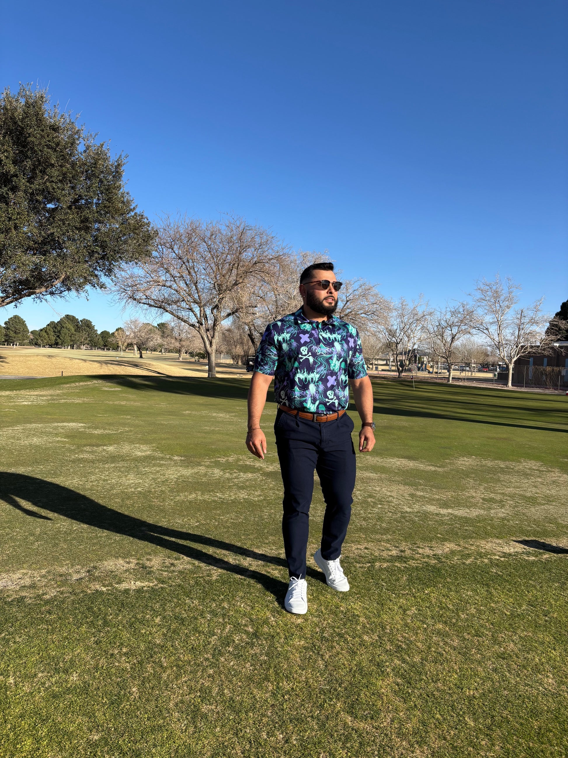 This lightweight Chamuco Golf performance shirt, crafted from 85% polyester and 15% spandex, is designed for ultimate comfort and style. Its breathable, moisture-wicking fabric ensures you stay dry and comfortable, even on the hottest days. With no external stitching, this shirt offers a sleek and clean look, perfect for intense rounds on the course or casual outings. The stretchable fabric allows unrestricted movement, while the full sublimation print ensures long-lasting, vibrant colors that stand up to repeated wear and washing. Look sharp and stay cool with Chamuco Golf shirts!